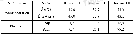 Cho bảng số liệu: Cơ cấu GDP phân theo khu vực kinh tế của một số nước trên thế giới năm
