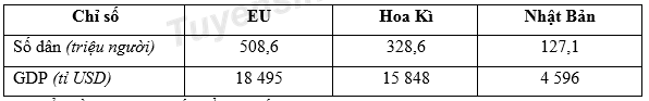 Cho bảng số liệu: Một số chỉ số cơ bản của các trung tâm kinh tế hàng đầu thế giới năm