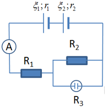 Cho mạch điện như hình vẽ: \({E_1} = {E_2} = 3V\), \({r_1} = {r_2} = 0,5\Omega \); \({R_1} = 2\Omega ,{R_2} =