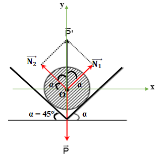 Hai mặt phẳng đỡ tạo với mặt phẳng nằm ngang các góc \(\alpha = {45^0}\). Trên hai mặt phẳng
