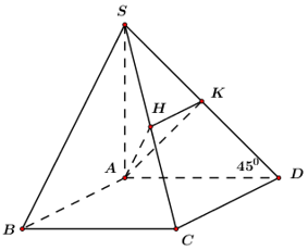 Cho hình chóp \(S.ABCD\) có đáy \(ABCD\) là hình vuông cạnh \(a.\) Hai mặt bên \(\left( {SAB} \right)\) và \(\left( {SAD} \right)\) cùng vuông góc với mặt đáy. Biết góc giữa hai mặt phẳng \(\left( {SCD} \right)\) và \(\left( {ABCD} \right)\) bằng \({45^0}.\) Gọi \({V_1};\,\,{V_2}\) lần lượt là thể tích khối chóp \(S.AHK\) và \(S.ACD\) với \(H,\,\,K\) lần lượt là trung điểm của \(SC\) và \(SD.\) Tính độ dài đường cao của khối chóp \(S.ABCD\) và tỉ số \(k = \dfrac{{{V_1}}}{{{V_2}}}.\)