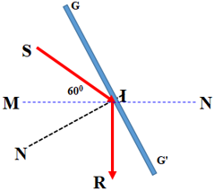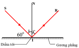 Chiếu tia sáng SI lên một gương phẳng sao cho tia SI hợp với mặt gương một góc bằng \({60^0}.\)
