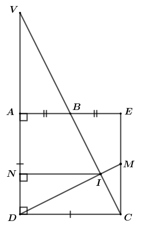 c) Biết \(DA\) và \(CB\) cắt nhau tại \(V\). Gọi \(N\) là hình chiếu của \(I\) trên \(AD\). Chứng minh \(N{I^2} = ND.NV\).