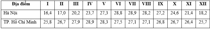 Cho bảng số liệu: NHIỆT ĐỘ TRUNG BÌNH CÁC THÁNG TẠI HÀ NỘI VÀ TP.HỒ CHÍ MINH (Đơn vị:
