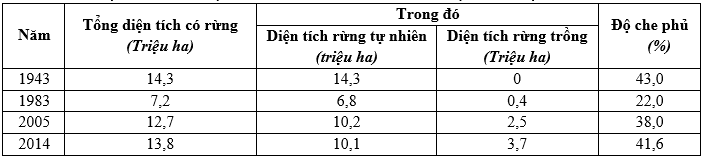 Cho bảng số liệu: DIỆN TÍCH VÀ ĐỘ CHE PHỦ RỪNG CỦA NƯỚC TA, GIAI ĐOẠN 1943 – 2014 (Nguồn: