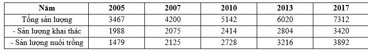 Cho bảng số liệu: Sản lượng thủy sản nước ta giai đoạn 2010- 2017