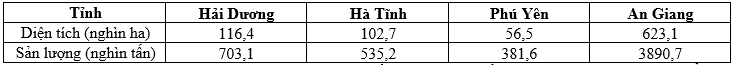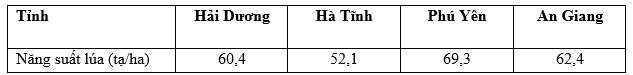 Cho bảng số liệu: Diện tích và sản lượng lúa của một số tỉnh năm 2017 (Nguồn: Niên giám