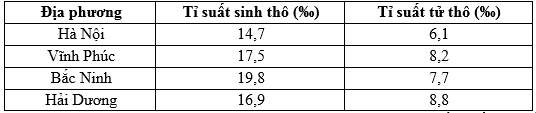 Cho bảng số liệu: Tỉ suất sinh thô, tỉ suất tử thô của một số địa phương nước ta năm