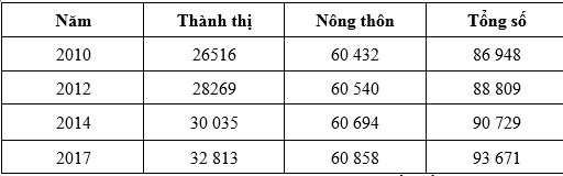 Theo bảng số liệu trên, nhận xét nào sau đây đúng về dân số nước ta phân theo thành thị và nông thôn giai đọan 2010 - 2017?