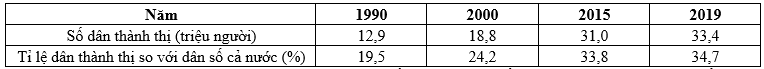 Cho bảng số liệu: Số dân và tỉ lệ dân thành thị nước ta qua một số năm (Nguồn: Niên giám