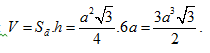 Cho khối lặng trụ tam giác đều có cạnh đáy bằng a, chiều cao bằng 6a. Tính thể tích V của khối lăng trụ đó.