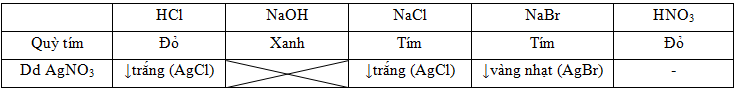 Có 5 ống nghiệm đựng 5 dung dịch: HCl, NaOH, NaCl, NaBr và HNO3. Bằng phương pháp hóa học hãy phân