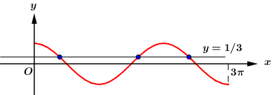 Sử dụng tương giao đồ thị hàm số: Số nghiệm của phương trình trên đoạn \(\left[ {0;3\pi } \right]\) là số giao điểm của đường thẳng \(y = \dfrac{1}{3}\) và đồ thị hàm số \(y = \cos x\) trên đoạn \(\left[ {0;3\pi } \right]\).