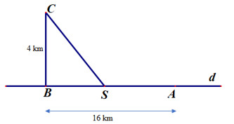 Một hòn đảo ở vị trí \(C\) cách bờ biển \(d\) một khoảng \(BC = 4\)km. Trên bờ biển \(d\) người ta xây một nhà máy điện tại vị trí \(A\). Để kéo đường dây điện ra ngoài đảo, người ta đặt một trụ điện ở vị trí \(S\) trên bờ biển (như hình vẽ). Biết rằng khoảng cách từ \(B\) đến \(A\) là 16 km, chi phí để lắp đặt mỗi km dây điện dưới nước là 20 triệu đồng và lắp đặt ở đất liền là 12 triệu đồng. Hỏi trụ điện cách nhà máy điện một khoảng bao nhiêu để chi phí lắp đặt thấp nhất?