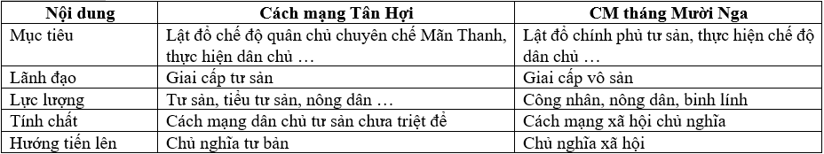 Dựa vào kiến thức đã học trong bài Trung Quốc giữa thế kỉ XIX - đầu thế kỉ XX, phần về Cách mạng Tân Hợi (1911) và bài Cách mạng tháng Mười Nga năm 1917 và cuộc đấu tranh bảo vệ cách mạng (1917 - 1921), phần về Cách mạng tháng Mười năm 1917 để so sánh theo các tiêu chí: Mục tiêu, lãnh đạo, lực lượng, tính chất, hướng tiến lên.