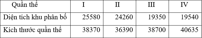 Giả sử kết quả khảo sát về diện tích khu phân bố (tính theo m2) và kích thước quần thể (tính theo số lượng cá thể) của 4 quần thể sinh vật cùng loài ở cùng một thời điểm như sau: