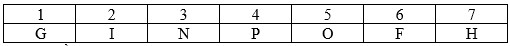 Có 7 người: F, G, H, I, N, O và P được xếp ngồi vào một hàng dọc gồm 7 ghế, đánh số 1 đến 7 từ trên xuống dưới, mỗi người 1 ghế. Các điều kiện sau được thỏa mãn: