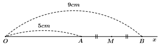 Vẽ tia \(Ox\). Trên tia \(Ox\), vẽ hai điểm \(A\) và \(B\) sao cho \(OA = 5cm,\,\,OB = 9cm\).