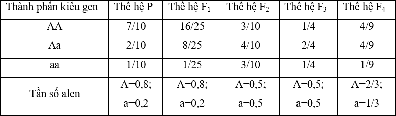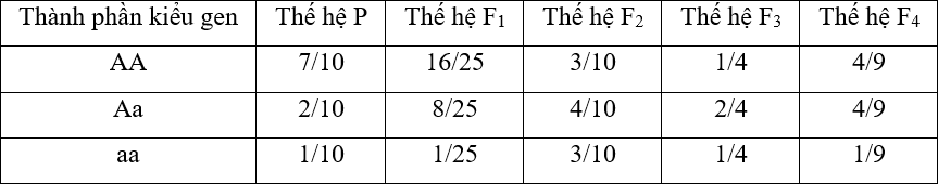 Một loài thực vật, xét 1 gen có 2 alen, alen A trội hoàn toàn so với alen a. Nghiên cứu thành phần kiểu gen của một quần thể thuộc loài này qua các thế hệ thu được kết quả ở bảng sau: