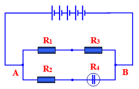 Cho mạch điện như hình vẽ: Bộ nguồn điện gồm 5 pin giống nhau, mắc nối tiếp, mỗi pin có suất điện động \({E_0} = 2,5{\rm{ }}V\) và điện trở trong \({r_0} = 0,1\Omega \,.\) Điện trở mạch ngoài: \({R_1} = 10\Omega ,\)\({R_2} = 15\Omega ;\) \({\rm{ }}{R_3} = 20\Omega ;\;\) \({R_4} = 5\Omega \) là điện trở của bình điện phân đựng dung dịch \(CuS{O_4},\) có anốt làm bằng đồng.