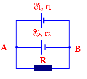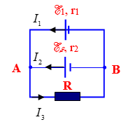 Cho biết \({E_1} = 2{\rm{ }}V,{\rm{ }}{r_1} = 0,1\Omega ;{\rm{ }}{E_2} = 1,5{\rm{ }}V,{\rm{ }}{r_2} = 0,1{\rm{ }}\Omega ;{\rm{ }}R = 0,2{\rm{ }}\Omega .\)