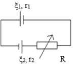Cho mạch điện như hình vẽ, \({\xi _1} = 10{\rm{ }}V,{\xi _2} = 2{\rm{ }}V,{\rm{ }}{r_1} = {r_2} = 1\Omega .\) R là biến trở. Điều chỉnh R sao cho hiệu điện thế giữa hai cực của nguồn \({\xi _2}\) bằng 0. Tính R?