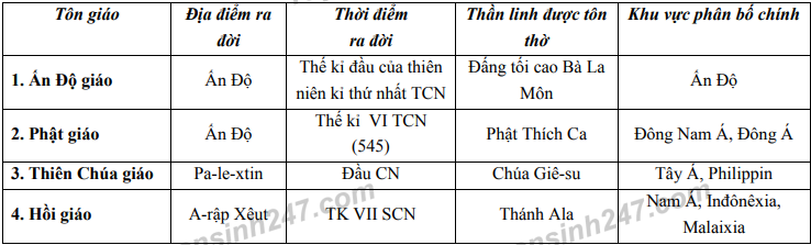 Trình bày đặc điểm, nơi ra đời của các tôn giáo lớn ở châu Á?