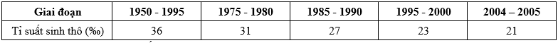 Cho bảng số liệu: TỈ SUẤT SINH THÔ CỦA THẾ GIỚI GIAI ĐOẠN 1950 – 2005 Hãy đưa ra câu nhận