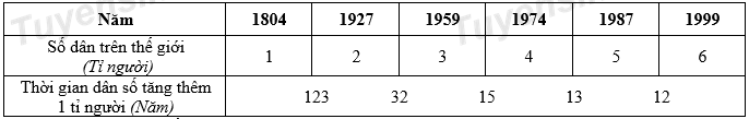 Cho bảng số liệu sau: THỜI GIAN DÂN SỐ TĂNG THÊM TỈ NGƯỜI GIAI ĐOẠN 1804 – 1999 Hãy đưa ra