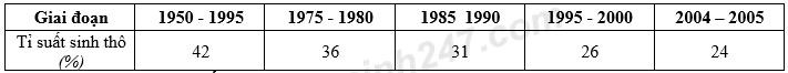 Cho bảng số liệu sau: TỈ SUẤT SINH THÔ CỦA CÁC NƯỚC ĐANG PHÁT TRIỂN GIAI ĐOẠN NĂM 1950 –