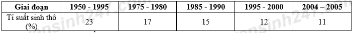 Cho bảng số liệu sau: TỈ SUẤT SINH THÔ CỦA CÁC NƯỚC PHÁT TRIỂN GIAI ĐOẠN NĂM 1950 - 2005 Hãy