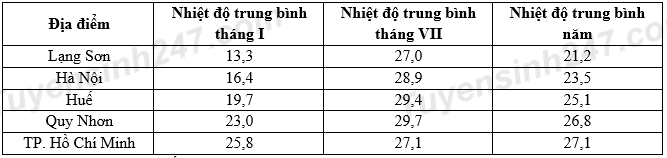 Cho bảng số liệu: NHIỆT ĐỘ TRUNG BÌNH TẠI MỘT SỐ ĐỊA ĐIỂM (Đơn vị: 0C) Nhận xét nào