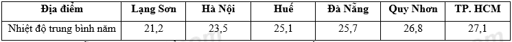 Cho bảng số liệu: NHIỆT ĐỘ TRUNG BÌNH TẠI MỘT SỐ ĐỊA ĐIỂM (Đơn vị: 0C) Nhận xét nào