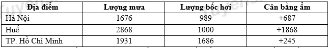 Cho bảng số liệu: LƯỢNG MƯA, LƯỢNG BỐC HƠI VÀ CÂN BẰNG ẨM Ở MỘT SỐ ĐỊA ĐIỂM (Đơn