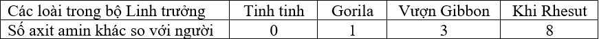 Để xác định mối quan hệ họ hàng giữa người và các loài trong bộ Linh trưởng (bộ Khỉ), các nhà khoa học phân tích sự sai khác về các axit amin trong chuỗi hemoglobin của các loài này so với chuỗi hemoglobin của người và thu được kết quả như sau: