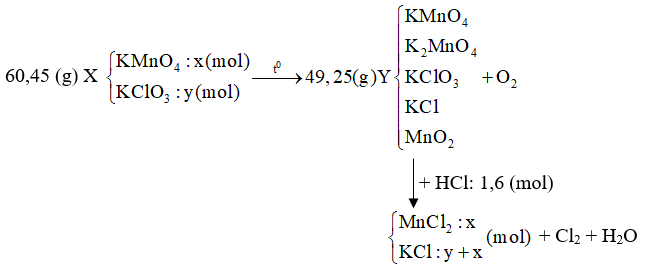 Nhiệt phân 60,45 gam hỗn hợp X gồm KMnO4 và KClO3, thu được O2 và 49,25 gam hỗn hợp rắn Y gồm