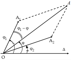 Sử dụng phương pháp vecto quay và định lí hàm số \(\cos \) trong tam giác.