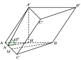 Cho hình lăng trụ \(ABC.A'B'C'\) có đáy \(ABC\) là tam giác đều cạnh bằng \(a\). Hình chiếu của điểm \(A'\) trên mặt phẳng \(\left( {ABC} \right)\) là trung điểm của đoạn thẳng \(AB\). Mặt bên \(\left( {AA'C'C} \right)\) tạo với đáy một góc bằng \({45^0}\). Thể tích của khối lăng trụ \(ABC.A'B'C'\) bằng