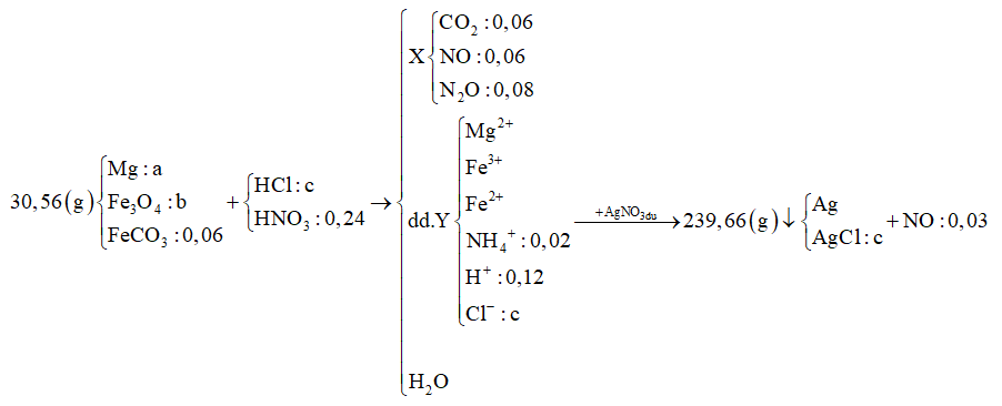 Hòa tan hết 30,56 gam hỗn hợp gồm Mg, Fe3O4 và FeCO3 trong dung dịch chứa HCl và 0,24 mol HNO3, thấy