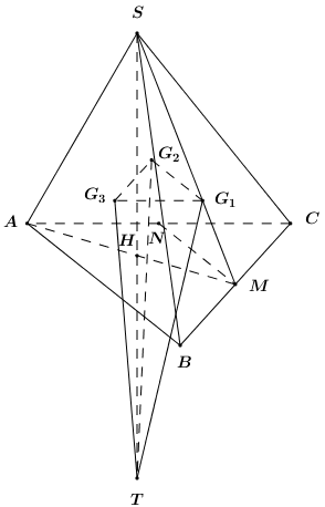 - Xác định tỉ số \(\dfrac{{d\left( {T;\left( {{G_1}{G_2}{G_3}} \right)} \right)}}{{d\left( {S;\left( {ABC} \right)} \right)}};\,\,\,\dfrac{{{S_{\Delta {G_1}{G_2}{G_3}}}}}{{{S_{\Delta ABC}}}}\), từ đó suy ra tỉ số \(\dfrac{{{V_{T.{G_1}{G_2}{G_3}}}}}{{{V_{S.ABC}}}}\).