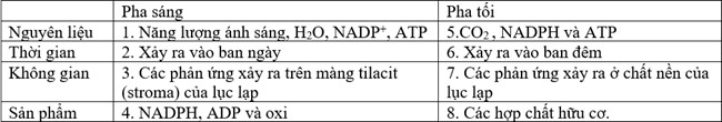 Dưới đây là bảng phân biệt hai pha của quá trình quang hợp nhưng có hai vị trí bị nhầm lẫn.