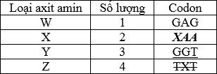 Dưới đây là trình tự một mạch mã gốc của một đoạn gen mã hoá cho một chuỗi polypeptide bao gồm 10 axit amin: 3 -TAX GGT XAA TXT GGT TXT GGT TXT TXT GAG XAA- 5. Khi chuỗi polypeptide do đoạn gen này mã hóa bị thủy phân, người ta thu được các loại axit amin và số lượng của nó được thể hiện trong bảng dưới (trừ bộ ba đầu tiên mã hóa Methionine)