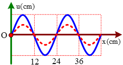 Trên một sợi dây \(OB\) căng ngang, hai đầu cố định, đang có sóng dừng với tần số \(f\) xác định. Gọi \(M,\,\,N\) và \(P\) là ba điểm trên dây có vị trí cân bằng cách \(B\) lần lượt là \(4\,\,cm;\,\,6\,\,cm\) và \(38\,\,cm\). Hình vẽ mô tả hình dạng của sợi dây ở thời điểm \({t_1}\) (nét đứt) và thời điểm \({t_2} = {t_1} + \dfrac{{11}}{{12f}}\) (nét liền). Tại thời điểm \({t_1}\), li độ của phần tử dây ở \(N\) bằng biên độ của phần tử dây ở \(M\) và tốc độ của phần tử dây ở \(M\) là \(60\,\,cm/s\). Tại thời điểm \({t_2}\), vận tốc của phần tử dây ở \(P\) là