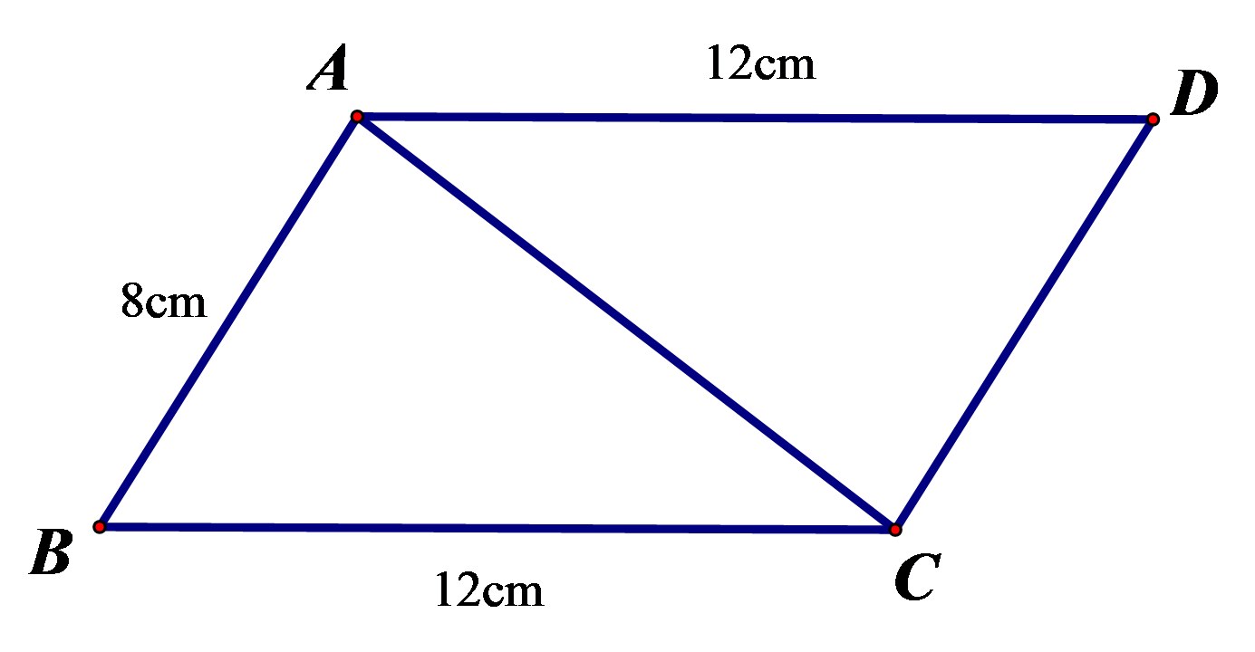 Cho hình bình hành \(ABCD\) có \(AB{\rm{ }} = {\rm{ }}8{\rm{ }}cm\), \(AD{\rm{ }} = {\rm{ }}12{\rm{ }}cm\) , góc