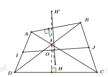 Cho tứ giác lồi ABCD. Gọi O là giao điểm của hai đường chéo; I, J là các điểm thỏa mãn các điều kiện \(\overrightarrow {IA} + \overrightarrow {ID} = \overrightarrow 0 \), \(\overrightarrow {JB} + \overrightarrow {JC} = \overrightarrow 0 \); H, H’ lần lượt là trực tâm của các tam giác OAB và OCD. Chứng minh rằng hai đường thẳng HH’ và IJ vuông góc với nhau.