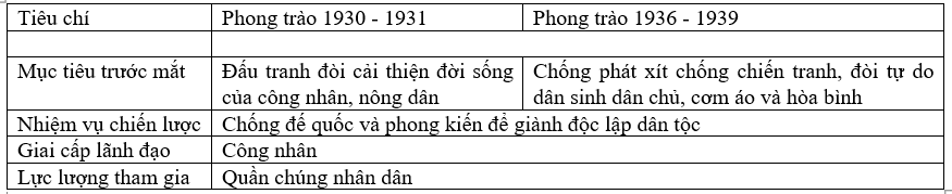 So sánh phong trào cách mạng 1930-1931 và phong trào dân chủ 1936-1939 thông qua các tiêu chí: Mục tiêu trước mắt, nhiệm vụ, lãnh đạo, lực lượng tham gia để rút ra điểm khác biệt giữa hai phong trào.