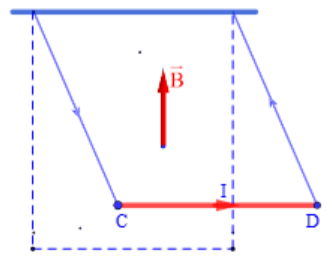 Một đoạn dây đồng \(DC\) dài \(20\,\,cm\), nặng \(12\,\,g\) được treo ở hai đầu