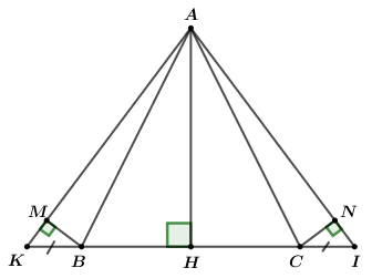 c) Trên tia đối tia \(BC\) lấy điểm \(K\). Trên tia đối tia \(CB\) lấy điểm \(I\) sao cho \(BK = CI.\)