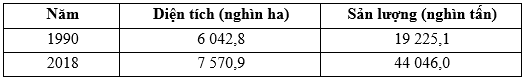 Cho bảng số liệu sau: DIỆN TÍCH VÀ SẢN LƯỢNG LÚA CỦA NƯỚC TA NĂM 1990 VÀNĂM 2018 Căn cứ