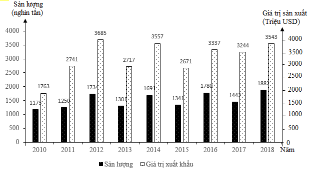 Căn cứ vào biểu đồ, hãy cho biết nhận xét nào sau đây không đúng về sản lượng và giá trị xuất khẩu cà phê Việt Nam trong giai đoạn 2010 – 2018?